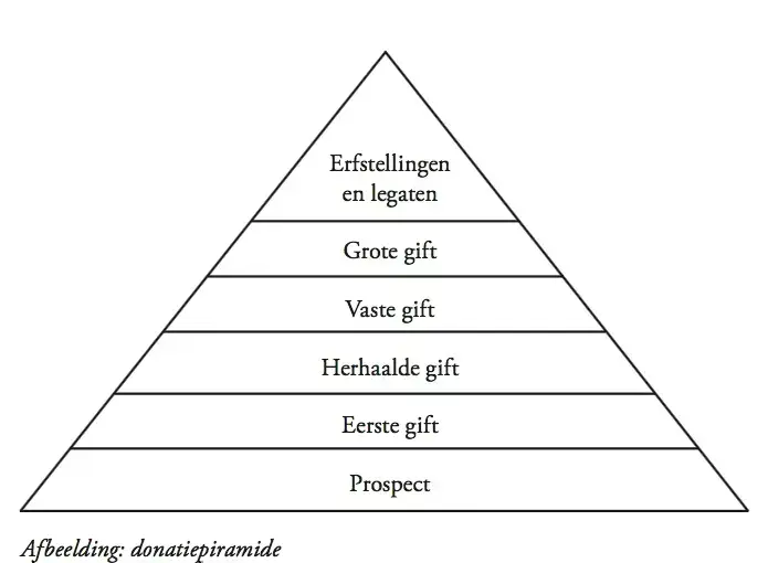 In de onderste laag bevinden zich de potentiële gevers, de prospects. Het is de bedoeling om hen te brengen tot een eerste gift.