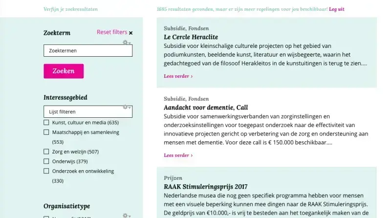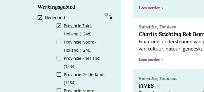 Sommige subsidieverstrekkers of fondsen zijn alleen actief in een of meerdere provincies. Het kan dus slim zijn om een selectie te maken op basis van de provincie. Je weet dan zeker dat de resultaten zo nauwkeurig mogelijk zijn.