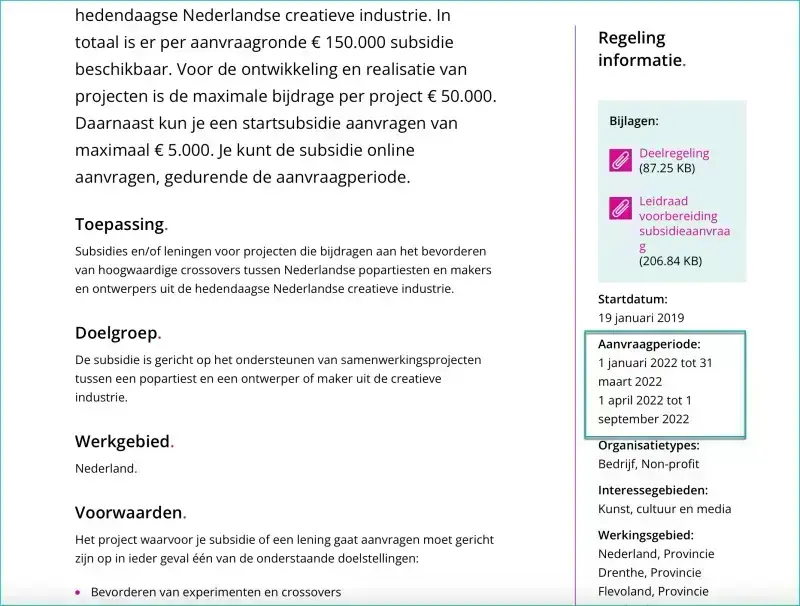 - Kijk dus goed na of de regelingen die voor jou interessant zijn een aanvraagperiode hebben